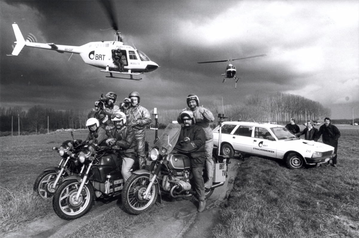 La première retransmission en direct d'une course cycliste par hélicoptère a eu lieu en 1963. Les images de la caméra portable de la moto étaient transmises à la tour de transmission via un relais héliporté. Cette méthode a été utilisée pour la diffusion du Tour des Flandres le 31 mars 1963, puis, plus tard la même année, des Championnats du monde à Renaix. « Le fait que le service des émetteurs et des liaisons radio fasse alors partie de la radiodiffusion publique a certainement contribué à cette innovation. Dans la plupart des autres pays, ces activités relevaient de la Poste, du Télégraphe et du Téléphone », selon le Musée de la Radiodiffusion (www.omroepmuseum.be).