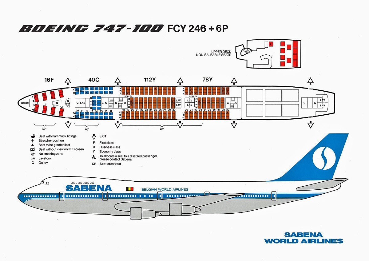 À partir du 747-200, Boeing a également fourni des avions équipés de moteurs General Electric ou Rolls-Royce, mais Sabena est restée fidèle à Pratt & Whitney pour ses nouveaux Boeing. À proprement parler, le 747-300 était l'évolution ultime du modèle original, intégrant pour la première fois un pont supérieur allongé dans lequel, à Sabena, 42 classe affaire Les passagers pouvaient s'asseoir. L'escalier en colimaçon d'origine a été remplacé par un escalier droit, plus large.